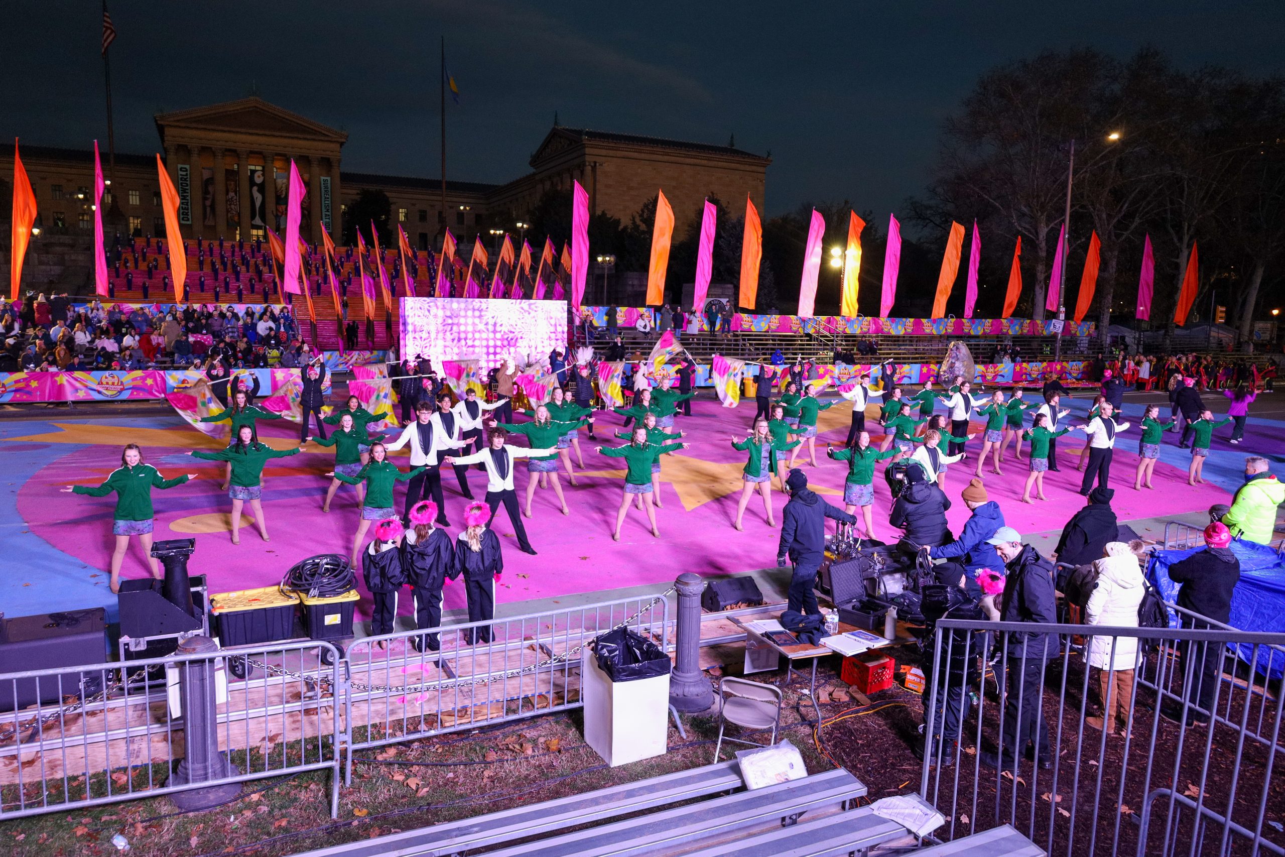Another 90 minutes later, the parade was approaching the grand finale. Once again, the Pendleton Heights HS performers took center stage with their energetic interpretation of “DJ Play A Christmas Song” by Cher. They were also featured on the Rocky Steps to the Art Museum as they framed Santa Claus.
